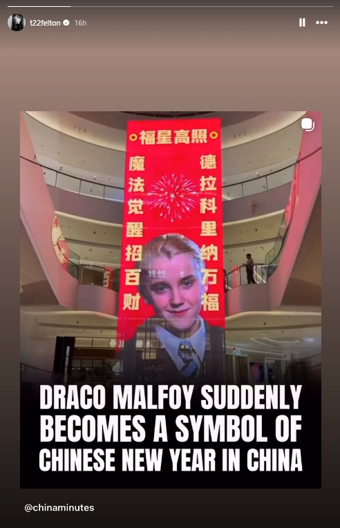 马尔福扮演者、现年38岁的英国演员汤姆·费尔顿当地时间3日也在社交媒体上回应这股热潮。CNN称,他在Instagram上转发了一则图片动态,图片中是中国商场内悬挂的一幅巨大马尔福春节海报,下方字幕写着“德拉科·马尔福突然成了中国新年的象征”。
